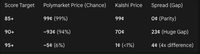 يحدد سوق كالشي أن هدف النقاط يجب أن يكون فوق 90. يسمح بوليماركت بحل نعم للأرقام التي تكون "على الأقل مساوية للرقم المحدد".