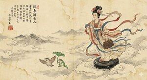 لوحة حبر صينية تقليدية مرسومة على ورق الأرز القديم. وقفت جنية من عهد تانغ ترتدي شرائط حمراء وبيج وسماوية، مع مشط وكعكة عالية وزهور الفاوانيا، على مكنسة كهربائية روبوتية سوداء دائرية وطارت في السحب.