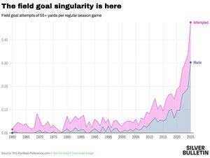 Mám pro vás takový opus magnum o tom, jak se NFL mění v téměř úplně jiný sport. A proč dostáváme tolik podivných zápasů s vysokým počtem gólů. Například počet 55+ yardových field goalů se od roku 2022 zvýšil 3x.
