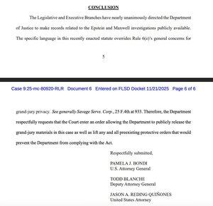 JUST IN: Das DOJ unternimmt einen neuen Versuch, alle Grand-Jury-Unterlagen zu Epstein in Florida zu veröffentlichen, und sagt, dass das neu von Trump unterzeichnete Gesetz die Geheimhaltungsgesetze der Grand Jury außer Kraft setzt.