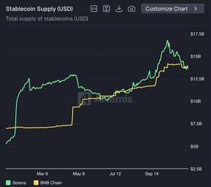 BNB hat jetzt Solana in Bezug auf das gesamte Stablecoin-Angebot überholt und ist mit 13,3 Milliarden Dollar im Umlauf zur drittgrößten Kette nach Stablecoin-Liquidität geworden, und hat damit Solanas 13 Milliarden Dollar übertroffen.