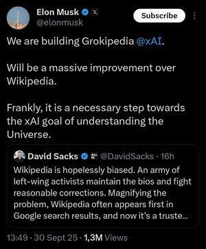 Elon Musk kündigte an, dass @xAI "Grokipedia" baut, eine unparteiische Alternative zu Wikipedia.