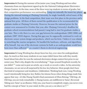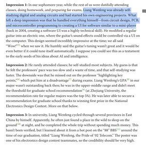 Descubierto en LessWrong: la visión de un compañero sobre Wenfeng la persona. Ya sabíamos que es un gran caso atípico, polímata, inconformista, etc. etc. Pero lo nuevo aquí: es un ingeniero eléctrico muy sólido. Nunca fue solo por software. Entiendo que cree que podrían hacer sus propias patatas fritas.