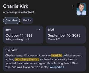 Nunca olvides, Wikipedia etiquetó a Charlie Kirk como de extrema derecha y teórico de la conspiración después de que fue asesinado.