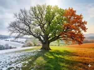 "a solitary, majestic ancient oak tree standing atop a rolling grassy hill" (This is the classic "Tree of Life" composition. It will show bare branches with snow -> cherry blossoms or buds -> lush green canopy -> red/orange foliage.)