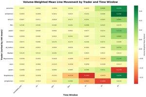 Top 15 operadores mensuales de Polymarket en PNL por volumen ponderado por el movimiento medio de la línea post-ejecución por marco temporal (05/11-11/13) PN1, Swisstony y 3BPTG tienen una ventaja muy consistente