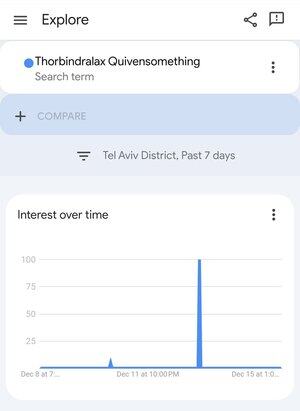 Como prueba, esta semana también hubo un gran aumento en el número de búsquedas en Tel Aviv del término "Thorbindralax Quivensomething" (). El único problema: es un término sin sentido que acabo de inventarme y que no da ningún resultado de búsqueda en Google.