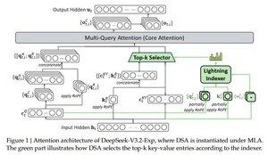 Además, el indexador usa FP8 mientras que el MLA principal usa 16 bits, por lo que = 64/576 = 1/9.