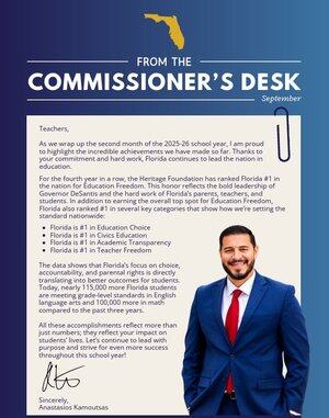 El boletín de este mes destaca con orgullo la clasificación más alta de Florida en Libertad Educativa y subraya la importancia de mantener una conducta profesional. También alienta a los maestros a comunicarse con sus representantes sindicales para seguir exigiendo los aumentos salariales inmediatos que merecen.