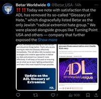 Betar, kova oikeistolainen israelilainen ryhmä, juhlii ADL:n tappiota ja esittää ryhmän tuomitsemista Maailman sionistikongressissa.