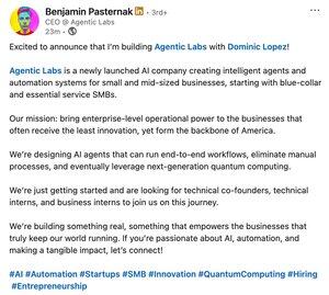 [ DOOMER ] BEN PASTERNAK ANNONCE UNE NOUVELLE STARTUP AI "AGENTIC LABS": LINKEDIN