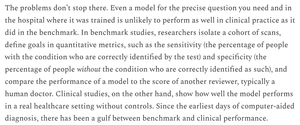 Un motivo è che i sistemi AI spesso funzionano peggio nelle impostazioni cliniche reali rispetto ai benchmark formali. Quindi sembra che i modelli AI siano "buoni quanto" i radiologi nella revisione delle immagini, ma in realtà non lo sono.