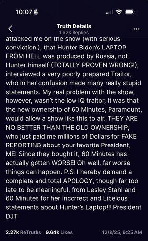 Trump ha appena parlato di Paramount e 60 Minutes su Truth Social.