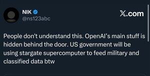 人々はこれを理解していません。OpenAIの主な情報はドアの向こうに隠されています。ちなみにアメリカ政府はスターゲイトのスーパーコンピュータを使って軍事や機密データを供給する予定です