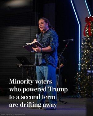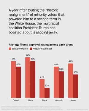 ドナルド・トランプ氏をホワイトハウスでの2期目に導いた少数派有権者は、ワシントン・ポストがまとめた全国8回の世論調査の平均で、徐々に離れつつある。