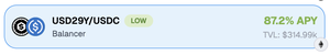 ステーブルコインプールの 87% APY。そしてそれは債券利回りが始🤯まる前の話です Rezervers がそこから 3 桁の APY をどのように絞り出しているかは次のとおりです 1️⃣ $USDCを Rezerve Liquid Bonds に入金します。 > 最大4年間ロック→最大40%のAPYを獲得できます。 >流動債券トークンであるUSD29Yを取り戻します。 2️⃣ バランサーでUSD29Y + USDCをペアリングして、プールで87%のAPYをファームします。 3️⃣ 両方の利回りをスタックします。 → 債券利回り + LP 利回り + 取引手数料。 → 常に液体を保ちます。 これは、ETHの財務省が成長し続ける一方で、ステーブルコインが2方向に汗を流しているということです。 LP→ボンド→→スタックETHをファームします。 それがRezerveループです