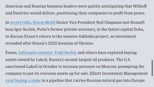 Oljeselskapets ledere, amerikanske milliardærer, Putins allierte og russiske oligarker under sanksjoner som møtes i Qatar for å planlegge å dele byttet i samarbeid med Trump-administrasjonens forhandlere, er for perfekt