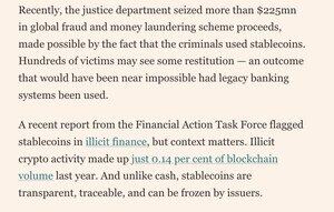 Og som vanlig var argumentet om krypto = kriminalitet dømt til å rulle ut angående stablecoins, og derfor minnet @katie_haun folk i Financial Times på at det gamle banksystemet, kontanter osv. – alt sammen mye verre, og faktisk slik systemet står i dag, er det ganske kraftfullt å bekjempe kriminalitet via blokkjedeteknologi (vi må ta hensyn til personvern, men likevel... )
