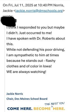In juni van dit jaar schreef een bezorgde burger aan de voorzitter van de DMPS-raad, Jackie Norris, en uitte zijn bezorgdheid over Ian Roberts die met 50-60 MPH (schatting) boven de snelheidslimiet over Fleur Drive scheurde. Jackie Norris reageerde op de zorgen met het volgende — “Hoewel ik zijn slechte rijgedrag niet verdedig, heb ik soms sympathie voor hem omdat hij opvalt - flashy kleding en kleur in Iowa!