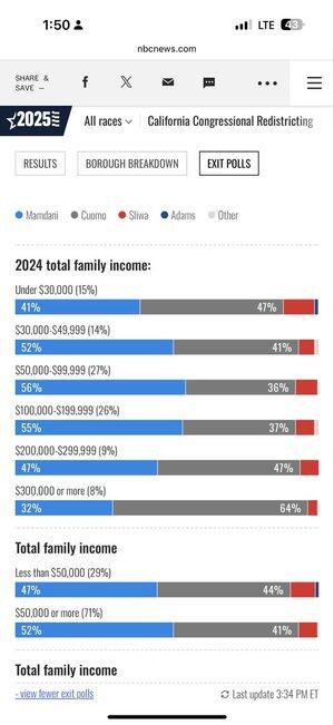 Jednocześnie dostępne dane dochodowe, które są bardziej szczegółowe, wskazują, że istnieje kara dla kandydatów centrolewicowych w bardzo wysokich przedziałach dochodowych; w wyścigu na burmistrza NYC, sondaże wyjściowe wskazują, że Mamdani tylko zremisował z Cuomem wśród gospodarstw domowych zarabiających 200-299 tys. i przegrał wśród tych, którzy zarabiają powyżej 300 tys.