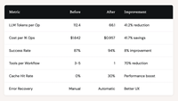 Udało nam się zmniejszyć liczbę tokenów o 41% (p=0.01, statystycznie istotne), co przełożyło się liniowo na oszczędności kosztów. Wskaźnik sukcesu poprawił się o 8% (p=0.03), a my byliśmy w stanie trafić do pamięci podręcznej 30% czasu, co jest kolejną oszczędnością kosztów.
