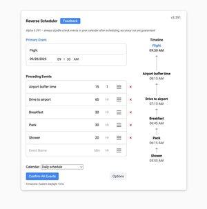 Os slots de teste alfa para o meu pequeno aplicativo Reverse Scheduler estão se esgotando rapidamente. Se você se beneficiaria de uma ferramenta para o Google Agenda que permite planejar seu itinerário de trás para frente a partir de um evento importante (como um voo, festa, etc.), inscreva-se aqui: