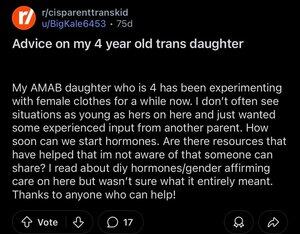 Redditor busca conselhos sobre como adquirir hormônios do mercado negro para fazer a transição de seu menino de 4 anos para uma menina.