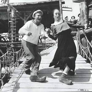 Robin Williams și Shelly Duvall pe platourile de filmare ale filmului Popeye, 1980.