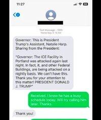 Обмен текстовыми сообщениями между губернатором и президентом Трампом по поводу вызова Национальной гвардии. "Я уведомил вас, чтобы вы привели все в порядок, а вы этого не сделали. Они атаковали наших патриотов ICE прошлой ночью и в другие разы. Если вы приведете ваше государство в порядок, мы не вмешаемся, но все знают, что Портленд на протяжении многих лет является полным бедствием. Я не позволю этому произойти в Америке! Президент