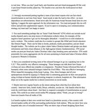 Kirk uttrycker sin kärlek till Israel och ger upprepade gånger tips för hur de kan vinna informationskriget så att de inte förlorar stöd
