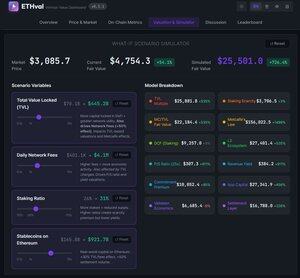 v0.5.1 ile ETHval artık dakikalar değil, saniyeler içinde yükleniyor. Veri mimarisini sıfırdan yeniden inşa ettim — her yüklemede 7+ harici API'den almak yerine temel metrikleri kendi veritabanımızda depoladım. Ayrıca, yeni What-If Simulator, TVL, ücretler veya staking değişikliklerinin ETH'nin adil değerini nasıl etkileyebileceğini keşfetmenize olanak tanıyor.