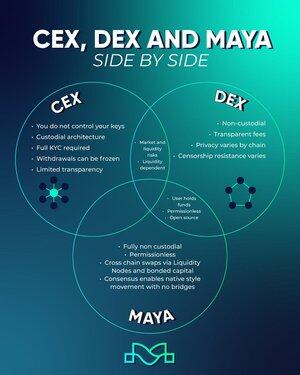 Коли ви поєднуєте CEX, DEX і Maya поруч, відмінності швидко з'являються.