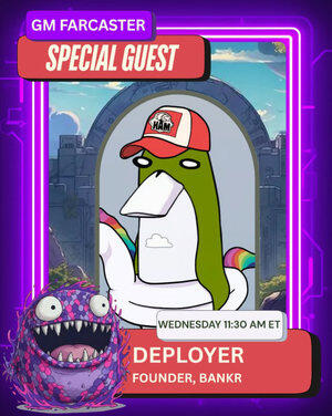 GM Farcaster повернеться завтра з дуже особливим гостем - @0xDeployer !! Ми поговоримо з Deployer про банкіра на початку шоу, а потім зануримося в @farcaster_xyz новини та оновлення CastOut після.