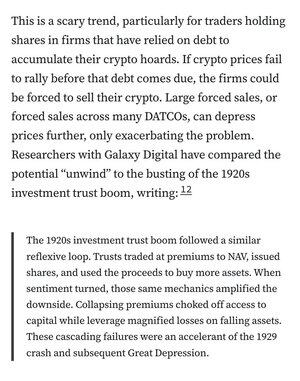 Це лякаюча тенденція. Якщо ціни на криптовалюту не відновляться, DATCO можуть бути змушені продати свою криптовалюту, що ще більше втягне ринок вниз. Дослідники Galaxy Digital порівняли цю модель і її потенційний розвиток із бумом і крахом інвестиційних трастів 1920-х років.