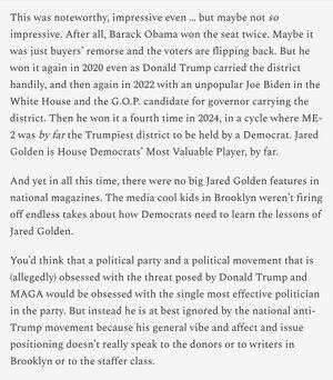Tôi không biết thực sự trong lòng Jared Golden có gì khi ông rời khỏi quốc hội, nhưng bạn phải nghĩ rằng ông ấy sẽ có nhiều nhiệt huyết hơn với công việc nếu những thành tựu của ông được công nhận đúng mức.