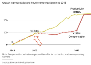 1. Năng suất đã tăng vọt trong khi lương không thay đổi với tốc độ gần như tương tự.