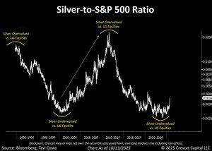 The updated Silver-to-S&P 500 ratio chart increasingly suggests the early stages of a major cycle where silver outperforms U.S. equities.