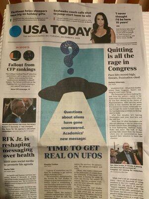 🇺🇸 《今日美国》头版UFO报道:“是时候面对UFO了” 《今日美国》刊登了一种你早晨通勤时很少见的节目:一个巨大的问号悬浮在飞碟上方,标题是“是时候对UFO做点现实了”。 这篇由菲德拉·特雷森撰写的故事,并非小报的垃圾。 报道了由马里兰大学迈克尔·西福内领导的科学家和学者运动,他们主张是时候认真研究未确认异常现象了。 Cifone和UAP研究学会表示,数十年的污名阻碍了合法研究。 他们呼吁举办国际会议、新的学术项目和开放数据共享,将这一话题带入主流科学领域。 仅是安置地点就已经很重要了。 在通常以政治、体育和流行文化为主导的头版,《今日美国》为UAPs提供了绝佳的曝光空间和大胆的视觉效果,同时还报道了国会退休和罗伯特·肯尼迪二世的健康宣传。 此时,包括国务卿鲁比奥在内的高级政府官员最近出现在热门纪录片《披露》中。 边缘音乐正在走向主流。 无论你认为UAP是外来技术、自然现象,还是完全不同的什么,话题已经正式从深夜广播转向了早餐桌。 来源:今日美国