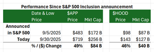 自标准普尔500指数纳入公告以来,$APP 和 $HOOD 的回报 在过去17个交易日中,$APP 上涨了49%,$HOOD 上涨了46%。 $MSTR 和 $APP 在排名上曾一度不相上下。 $MSTR 下次纳入的机会在12月。