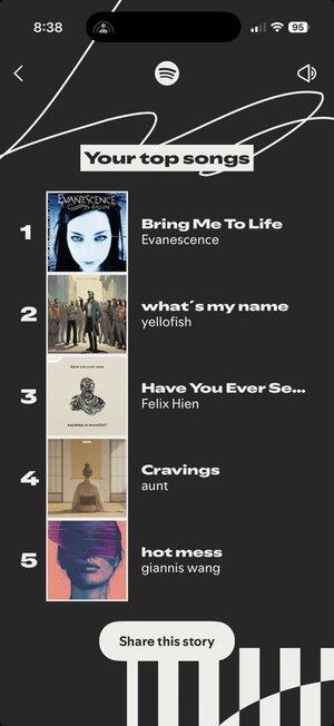 > 你在 Spotify Wrapped 上的热门歌曲是什么?! > 哦,就一些正常的东西 > 什么?你的歌曲是什么? > 哦,就一些正常的东西,Evanescence 然后是 4 首 lofi 音乐,你呢?