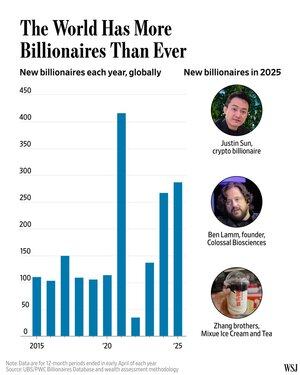 到2025年,全球亿万富翁的总数达到了新高。 现在大约有2,900位亿万富翁控制着15.8万亿美元的财富,而一年前大约有2,700位亿万富翁的总财富接近14万亿美元。 🔗 阅读更多: