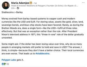🧐 在新兴市场中,‘$$$’ 通常被选择作为一种风险较低的替代品,以应对更大的波动性。 而稳定币则提供了与法定资产挂钩的稳定性,但没有传统银行系统的限制。 是的,Polygon 不仅“理解”这个问题,还在构建一个真正的基础设施,使稳定币成为远离法定货币的进化步骤。 新兴市场的人们可以使用稳定币进行支付、储蓄和投资,几乎没有障碍,交易速度极快,而不仅仅是把‘$$$’ 放在床垫下。 这将‘$$$’的历史崩溃与加密货币的未来联系起来,在这个未来中,@0xPolygon 扮演着旧世界金融与链上经济之间真正支付“桥梁”的角色。