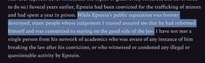 "是的,爱泼斯坦被指控贩卖儿童……但其他人告诉我,他现在是一个改变了的人!"