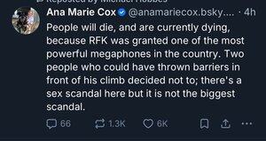 《新共和国》撰稿人安娜·玛丽·考克斯谴责瑞安·利扎和奥利维亚·努齐,暗示他们没有尽一切努力阻止RFK Jr.上台,因此手上沾有鲜血。