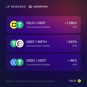 Velodrome Slipstream LP 獎勵 🚴♂️ • $CELO - $USDT: ~1,198% • $USDT - $WETH: ~243% • $USDC - $USDT: ~48% 探索所有 @celo LP 機會,請訪問 Velodrome 的流動性頁面
