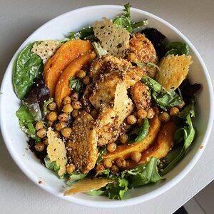 秋季沙拉 🥗 烤南瓜、煎炸的紅椒調味芝麻雞胸肉和鷹嘴豆、烤帕爾馬乾酪脆片、庫斯庫斯、生菜、由烤洋蔥和芥末製成的醬汁 #cryptosoupgroup