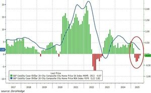 美國房價正在緩慢下滑: 美國20個最大城市的房價在8月份環比下降了-0.07%,低於預期的-0.20%降幅。 這標誌著連續第五個月的下降,這是14年來第二長的連續下降期。 然而,與去年同期相比,房價仍上漲了+1.82%,這是自2023年7月以來最小的增幅。 與此同時,經通脹調整後的美國房價錄得連續第三個月的下降。 儘管如此,實際房價仍然比2006年房市泡沫的高峰高出約10%。 美國房地產市場是否正接近轉折點?
