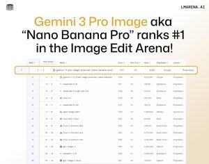 🚨突發消息:@GoogleDeepMind 的 gemini-3-pro-image "Nano Banana Pro" 現在在文本到圖像和圖像編輯領域中排名第一。 🥇#1 文本到圖像(比 nano-banana 高 84 分) 🥇#1 圖像編輯(比 nano-banana 高 41 分) 兩個 Nano Banana 模型在圖像編輯排行榜上都佔據了最高位置,並且在文本到圖像中進入前三名。 這一周的排行榜變動非常大,這些新分數為競技場增添了更多動力。 恭喜 @GoogleDeepMind 達成這一里程碑時刻!Nano Banana Pro 的 2k 和 4k 版本也即將推出。🍌💪