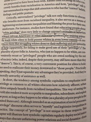 "教育人們關於 '白人特權' 對於改變任何人對非裔美國人或其他少數族裔的態度或行為幾乎沒有任何幫助。相反,這種訓練主要使白人精英對較貧困的白人持有更低的評價"