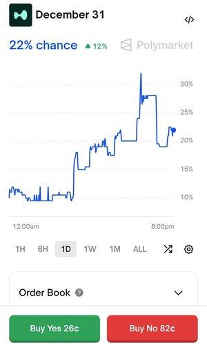🚀 Hyperliquid 空投在 31/12 之前的概率在 @Polymarket 更新:一天內從 10% 提升至 30% 的概率 Hyperliquid 的空投機率今天突然從 10% 跳升至 30%。 是否有人發現了我們尚未注意到的事情?👀 有任何內部消息、謠言或鏈上提示值得查看嗎?🕵️♂️